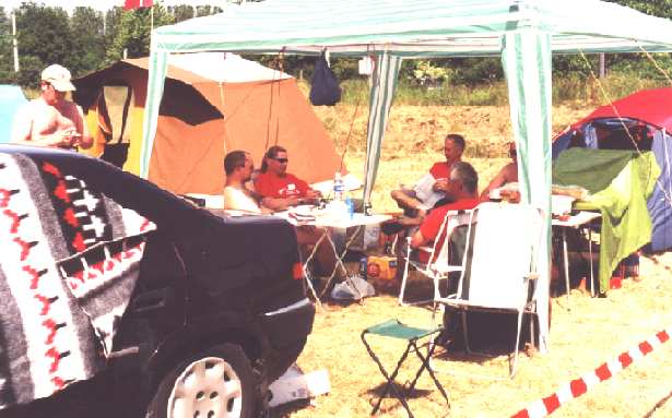 Le Mans campsite. Nose of a red Jupiter, tails of two more Jupiters, and the banner prepared by Ib Rasmussen to mark the Anglo-Danish site.