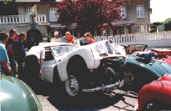 The white Adams & Robinson saloon Jupiter (above) was driven by Andy Stevens and Philip Dingle. Three Jupiters took the chunnel. Although Jupiter HAK366 was basically drivable, engine bothers meant that the 1951 Le Mans race car arrived on the trailer behind our recovery vehicle generously provided by Jupiter owner Tom Chapman at his own expense. (Tom owns the surviving saloon Abbott bodied Jupiter and is about halfway through its thorough restoration).